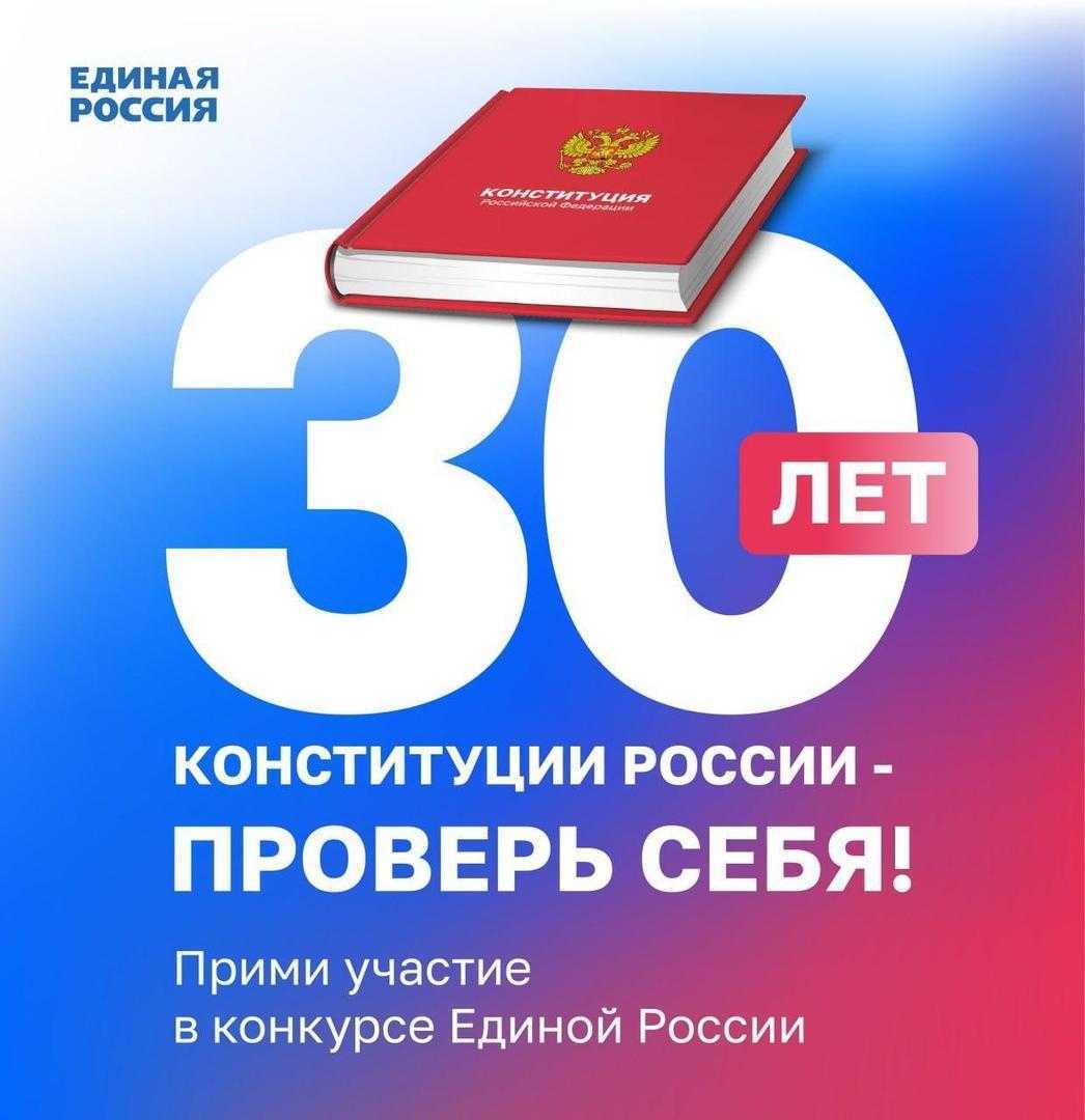 В этом году Конституции Российской Федерации исполняется 30 лет. В связи с этим событием учрежден Всероссийский онлайн-конкурс «30 лет Конституции России – проверь себя!». В период с 1 октября по 25 ноября все желающие граждане страны старше 18 лет могут принять в нем участие.